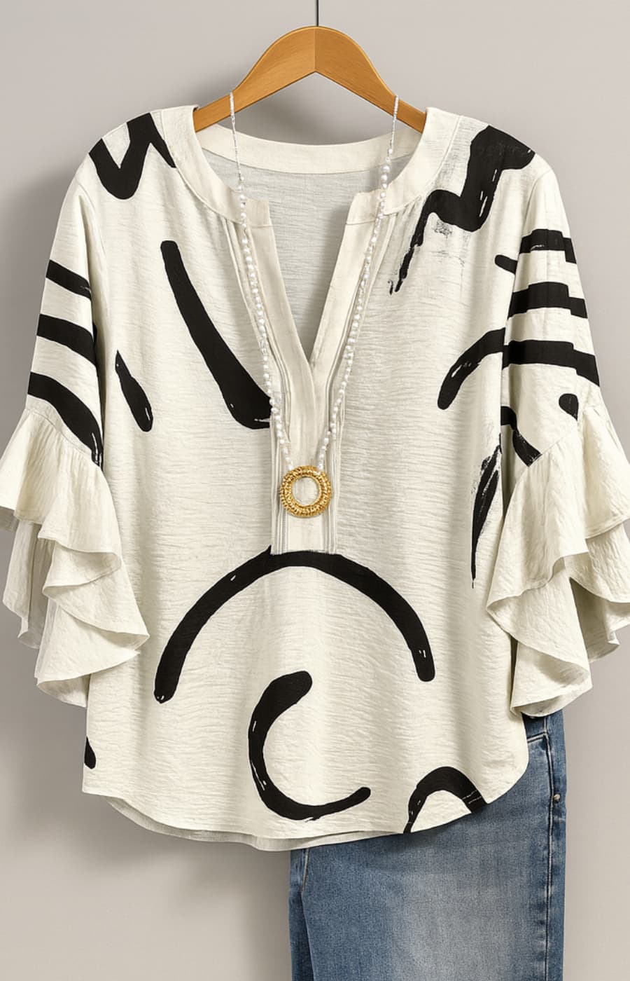 Esta blusa de fondo azul empolvado con estampado floral combina la suavidad de un tejido de alta calidad con un diseño que realza la feminidad de manera sutil y elegante. Las mangas con volantes dan movimiento y estilo, mientras que el escote en V alarga visualmente el cuello y afina el rostro. Ideal para días especiales o para elevar lo cotidiano con un toque de arte y buen gusto.