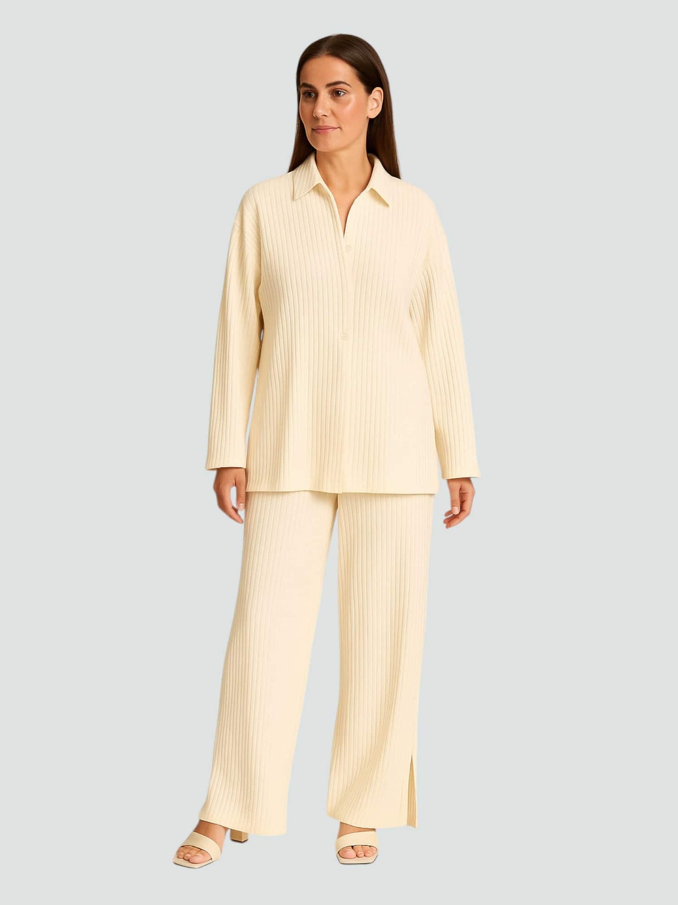 Un conjunto diseñado para la comodidad con estilo. El tejido acanalado cae con suavidad y crea una silueta relajada pero sofisticada. Ideal para los días en los que quieres sentirte libre sin renunciar a la elegancia.