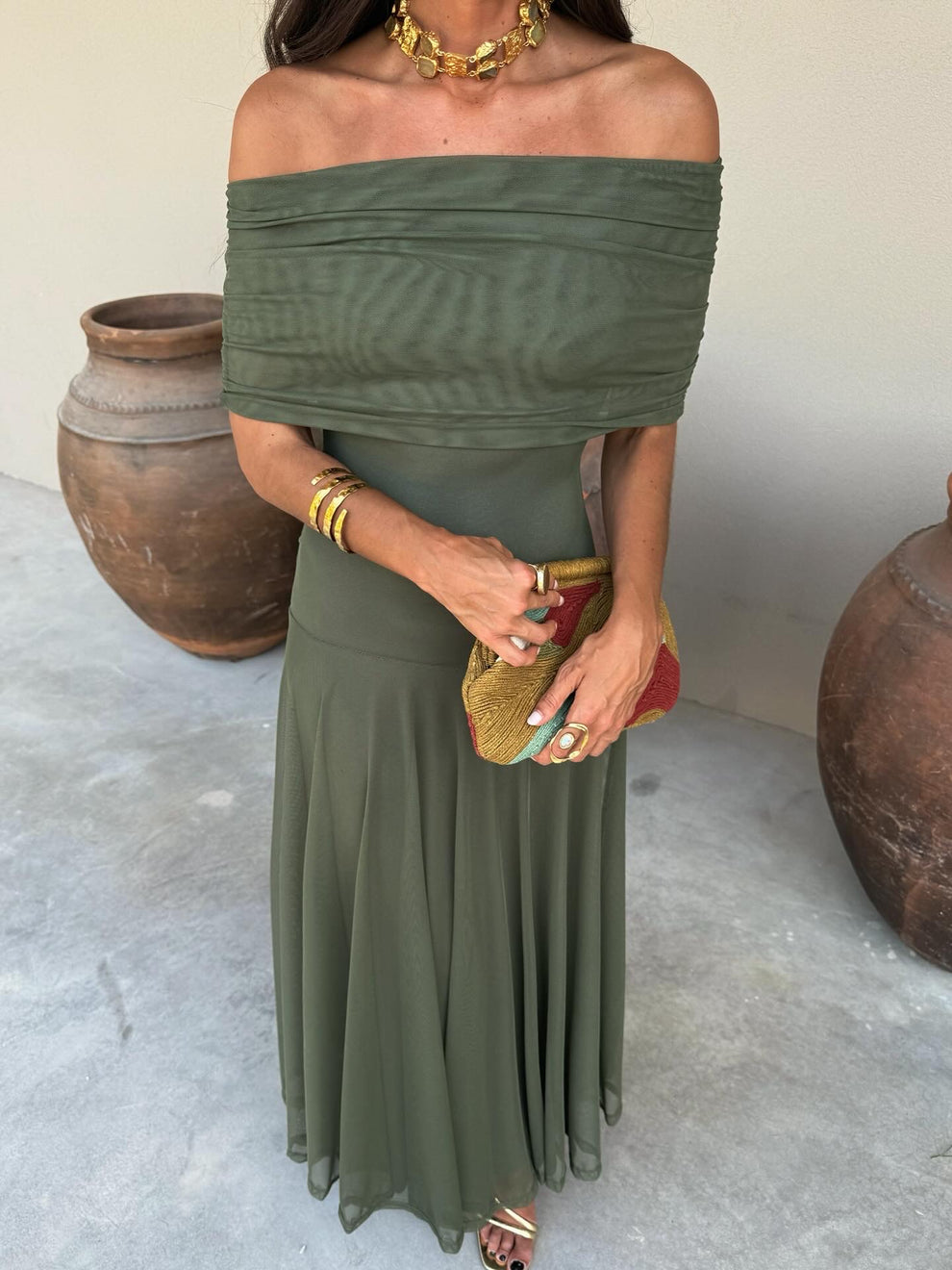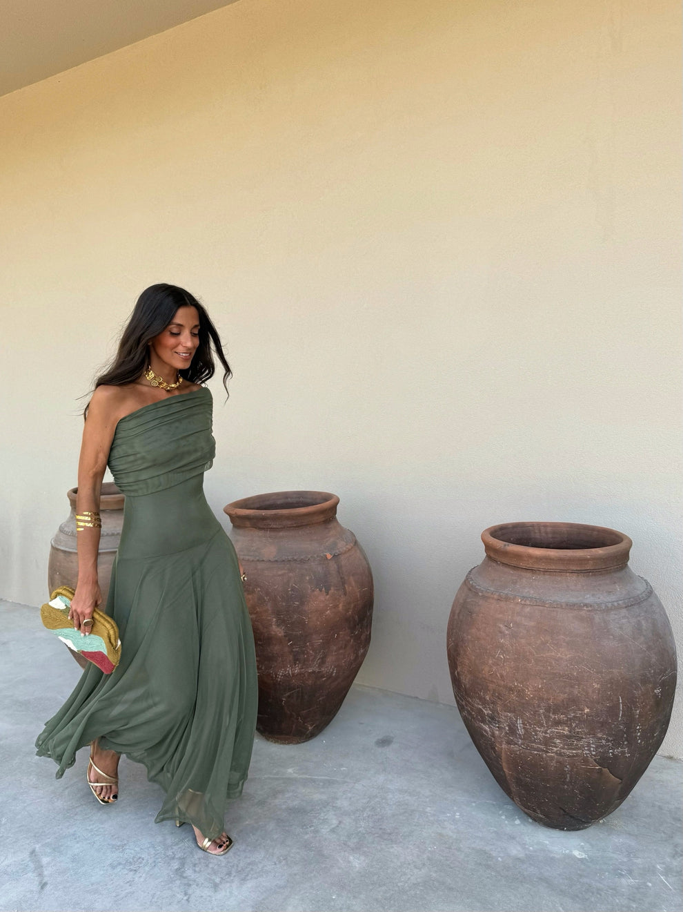 Confeccionado en gasa ligera y vaporosa con caída fluida, ideal para eventos de día o noches veraniegas. Su falda amplia aporta movimiento y un toque romántico.
